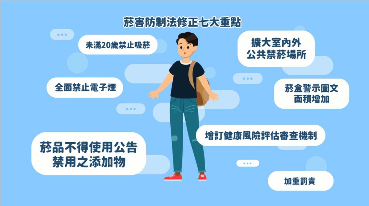 《菸害防制法》修法於112年1月12日立法院三讀通過,2月15日總統公布,後續由行政院訂定施行日期,七大重點修正如下: